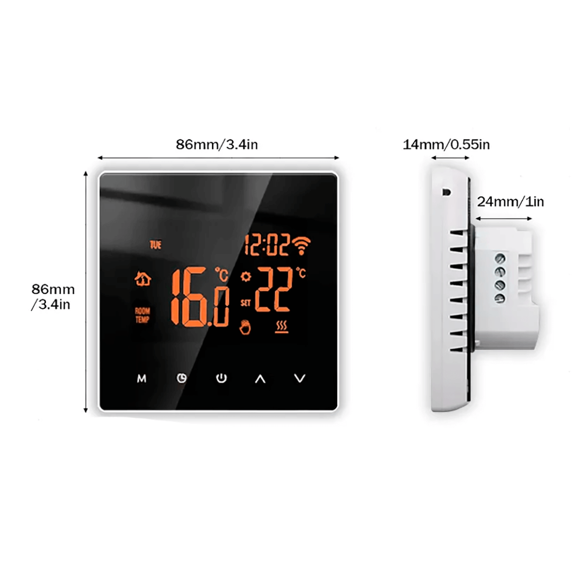 • Элегантный внешний вид и современный дизайн термостата отлично впишутся в любое помещение: дом, офис, отель, торговый центр. Комнатный регулятор имеет большой информативный жидкокристаллический зеркальный экран с сенсорным управлением и защитой от царапин. Дисплей оснащен сенсорными кнопками с оранжевой подсветкой для упрощения работы. При необходимости подсветку можно отключить.